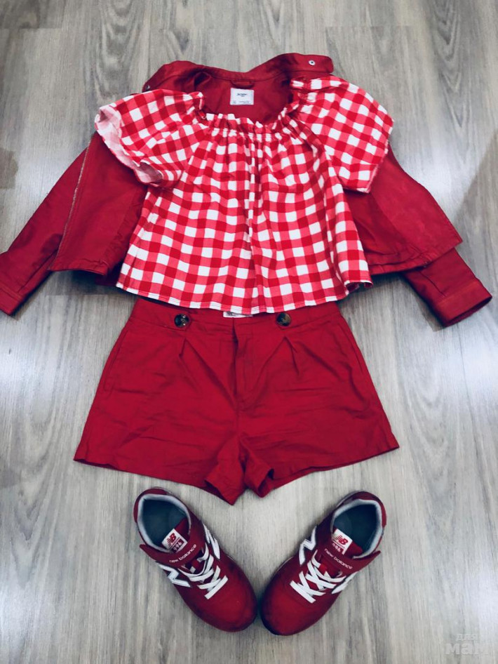 В подарок к курточке комплект красный Зара - красные шорты б/у 14 лет и блузка красная в клетку 12 лет (комплект подойдет отлично к куртке, на рост 146-158 в зависимости от комплекции). Красная куртка ПРОДАНО