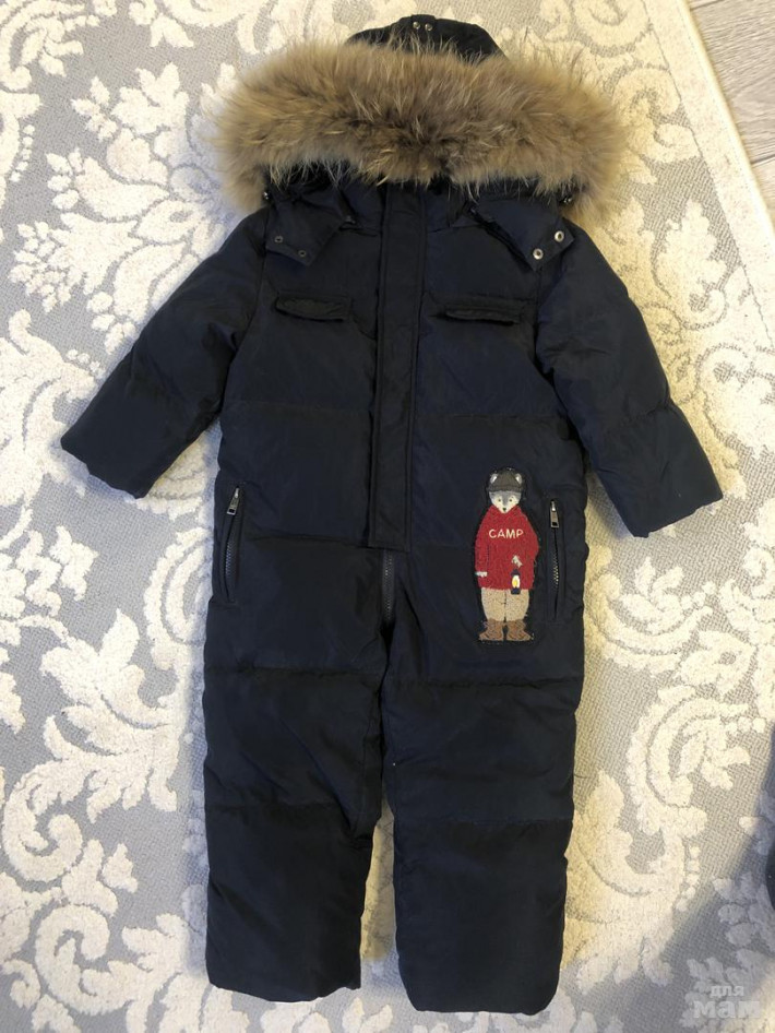 Пуховый комбез, нат мех.цвет темно-синий. Имеются дефекты по краям штанин, аккуратно зашиты. На ребёнке совсем не заметно. Подробные замеры, фото и видео пришлю в вотсап или в личку.
