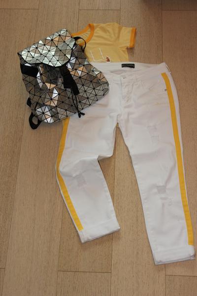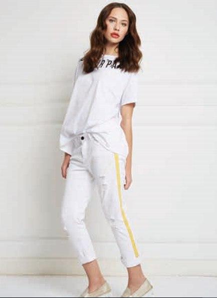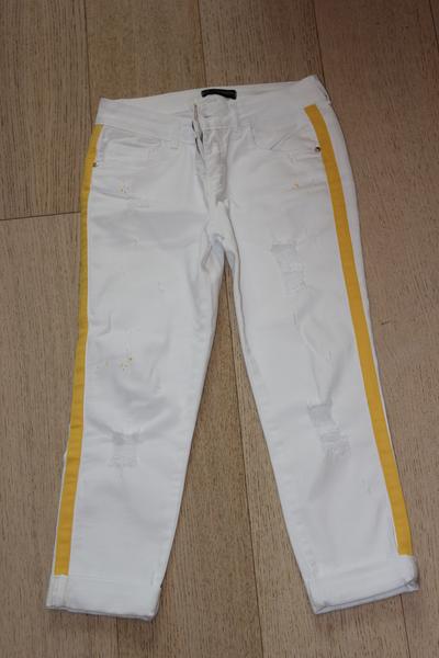 Очень классные легкие брюки (бренд QUE&GUAPA, Италия) с декоративным потертостями и желтыми лампасами. Качество превосходное. Это Италия шьет для Италии, Испании. Посадка средняя. Очень приятные на ощупь, хорошо тянутся и за счет этого отлично садятся на любую фигурку.