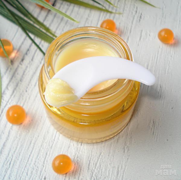 Масла: облепиховое, ши, аргании, макадамии, жожоба, пенника лугового. Эти масла активно увлажняют кожу, оздоравливают и очищают, насыщают её жирными кислотами. Масло облепихи богато витаминами A, E и C, эффективно напитывает и увлажняет нежную кожу, отлично борется с трещинками и сухостью.