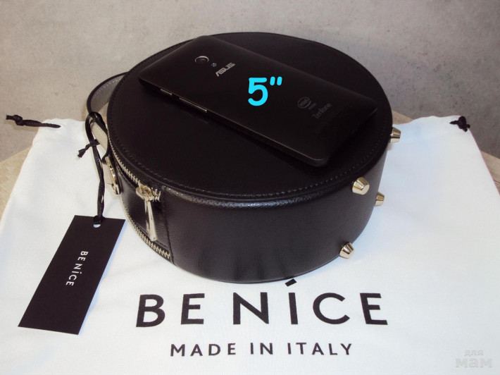 Диаметр 19 см. Сумочка вместительная (легко поместится большой смартфон, кошелек, компактный зонтик), но не выглядит громоздкой. Чуть больше хитовых круглых сумочек от Cromia, в размер круглых сумочек Sara Burglar.