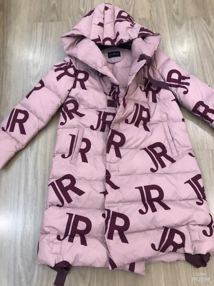 Классное пуховое итальянское пальто Ричмонд, р.14 лет, холодная весна-осень, удобный капюшон, аббревиату́ра бренда по всему пальто, за лето выросли, рассчитывали сейчас носить, 11500 р. по старому курсу евро.