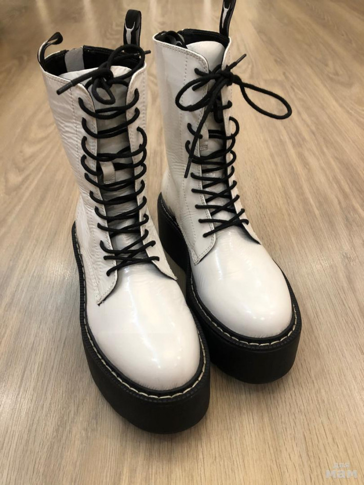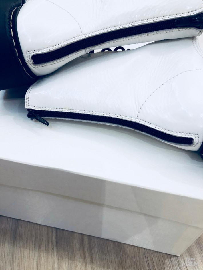 Супер нарядные лаковые белые ботинки Windsor Smith Италия! Все натуральная наимягчайшая кожа, очень практичная черная подошва, да и саму белую лаковую кожу можно протереть просто влажной губкой. Ботинки на шнуровке и сзади на молнии, очень удобно одевать. Продаю, так как они маломерят на размер - по стельке 24,5 см.