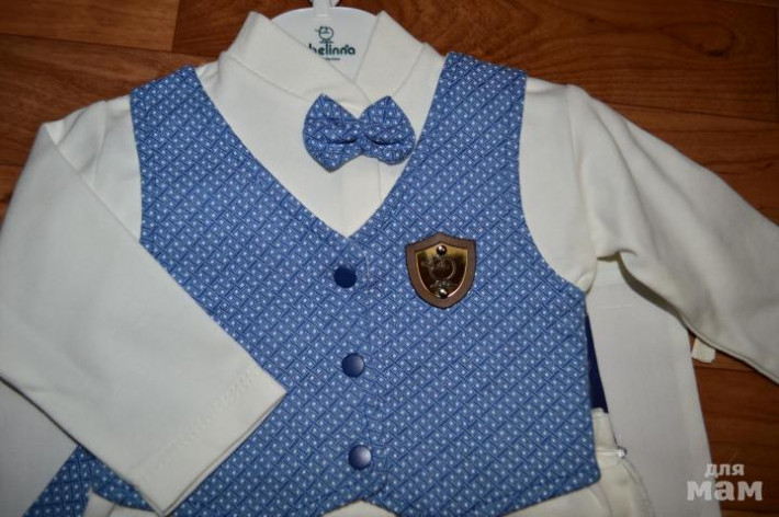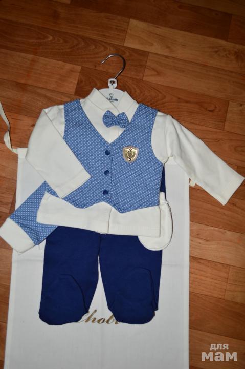 Совершенно новый костюм, очень удобный! В комплект входит: рубашка- кофточка, бабочка, ползунки- штанишки, рукавички, шапочка и слюнявчик, всего 6 позиций. Можно одеть в Роддом! На возраст до 3 месяцев, покупала за 2100р. для фотосессии, но с пандемией не пошли.