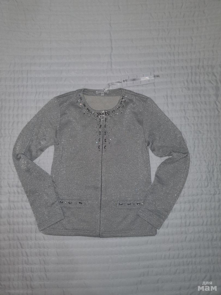 Кардиган Artigli Италия, новый! ,размер 8лет. По этикетке размер 10лет, маломерит. На молнии, с серебряным люрексом, украшен стразами. Отлично в школу и на торжества)