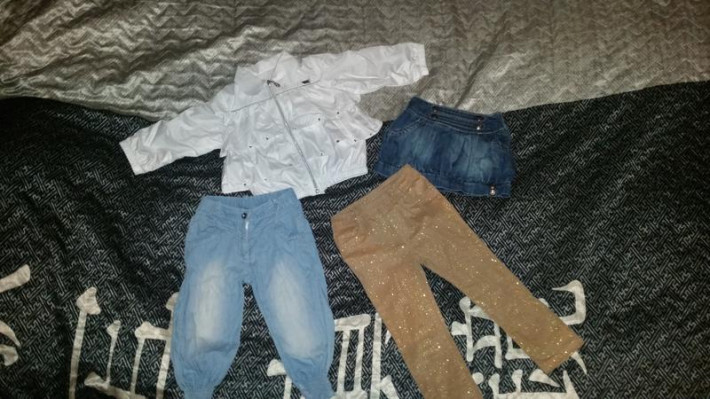 все в хорошем состоянии. Лучше на худенькую девочку. Джинсы и курточка до 90см примерно. Юбочка и джегинсы до 92 на худышку. По 300руб. Все вместе 1000руб.
