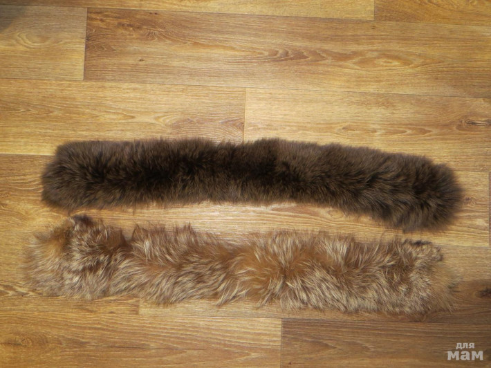 Меховые опушки на капюшон песец и искусственный мех.Фото № 2 Песец (на пуговицах для крепления на пуховик и не только). Длина 77 см.Фото №4 Искусственный мех (петли для пуговиц). Длина 76 см.
