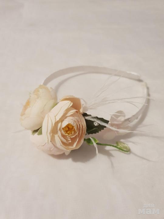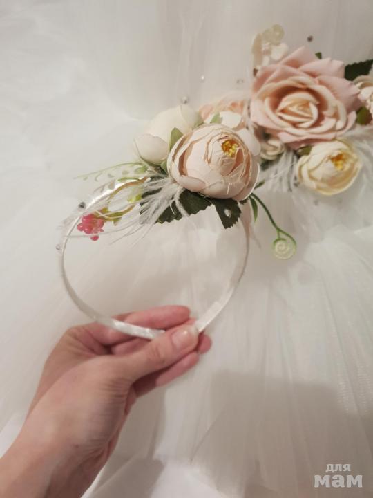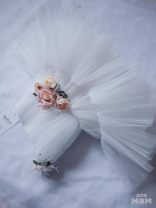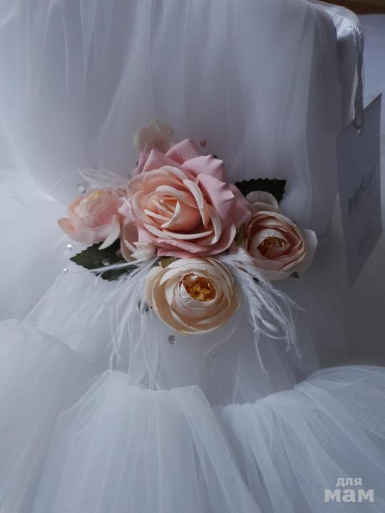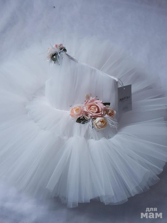Новое платье, с биркой. Цвет молочный. Супер пышное! Украшено розами, натуральными перьями и стразами на талии и плече. Подклад и основа - хлопок. Размер примерно на годик. К платью есть ободок с цветами, перьями и стразами. Продается комплектом. Самовывоз, почта России, СДЭК.