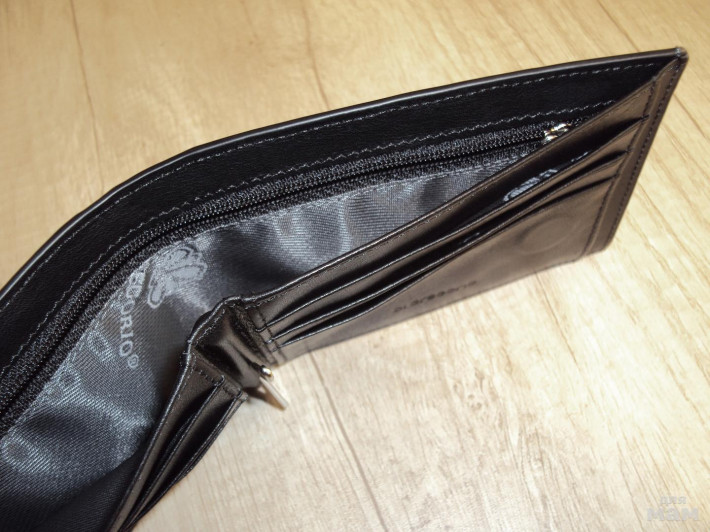 Внутри зажим для купюр, 6 карманов для карт, 2 потайных кармана (см. фото 6) и 2 отдела для купюр (открытое и на молнии).