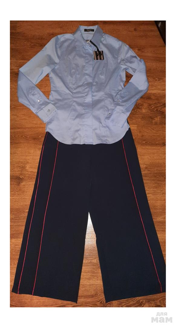 Рубашка шикарная, хлопок благородного качества, чуть тянется для комфортной носки. Брюки-палаццо глубокого темно-синего цвета, замок сбоку, пояс. Смотрятся в точности, как на каталожном фото.