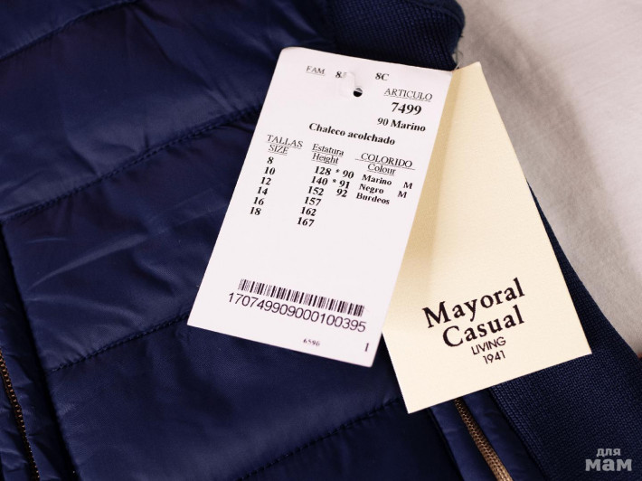 Стеганый стильный жилет MAYORAL с синтетическим утеплителем. Воротник-стойка. Капюшон из тонкой плащевой ткани, прячется в воротник. По бокам эластичные трикотажные вставки. Карманы врезные на молниях.