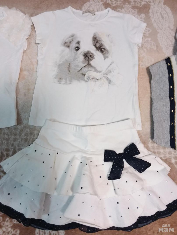 2)юбочка MONNALISA (27 см пояс, 25 смпо бок..шву) и футболка lesy с собачкой длина по спине 36 см, пог 30 см на 3 года 2200