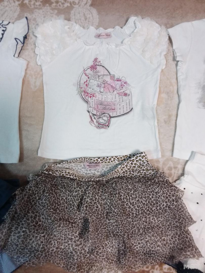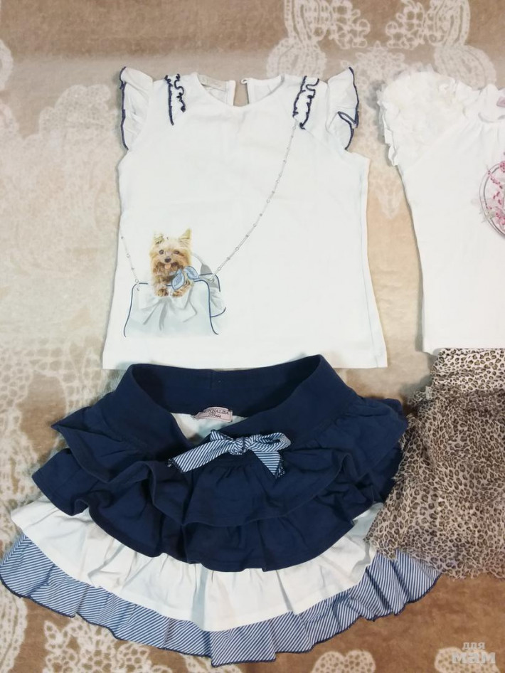 1)юбочка MONNALISA лео на резиночке,(пояс 26см, длина по бок.шву 25)очень удачная! и футболка BLUMARINE (длина 32 см, пог 30 см)с сумочкой очень красивый комплект на 3 года, 2600