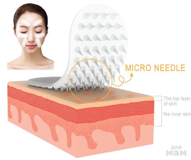 Микроиглы состоят из низкомолекулярной гиалуроновой кислоты, проникая глубоко в эпидермис, они растворяются и заполняют мимические морщины. Уникальность такого продукта состоит в том, что эти иглы служат для транспортировки активных веществ в более глубокие слои кожи и в разы повышают эффективность продукта. Патчи с микроиглами помогают удерживать влагу в клетках эпидермиса и препятствуют ее испарению, стимулируют синтез коллагена, повышают упругость кожи и помогают справится с отеками.