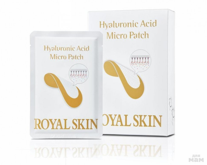Омолаживающие патчи с микроиглами из гиалуроновой кислоты Royal Skin Hyaluronic Acid Micro Patch. Продукт является аналогом салонной процедуры мезотерапии и позволяет проводить её в домашних условиях. Микроиглы из гиалуроновой кислоты абсолютно не травмируют кожный покров, но способны проникать глубоко в эпидермис и способствуют омоложению кожи на клеточном уровне. Патчи обладают эффектом лифтинга, разглаживают и уменьшают глубину морщин, интенсивно увлажняют и ускоряют регенерацию, подтягивая и укрепляя тонкую кожу в области глаз.