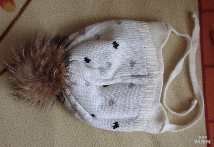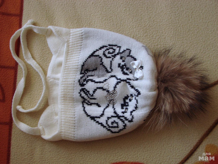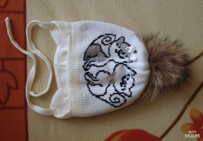 Новая теплая зимняя шапочка Aguti, р.52. Очень красивая: впереди 2 кошечки, украшенные стразами, сзади - сердечки. Двухслойная (и сама шапочка и ушки), полушерстяная (50% шерсть, 50% акрил). Отстегивающийся помпон из натурального меха. Этикетки нет, т.к. собирались носить, но переросли. Покупали за 1000р.