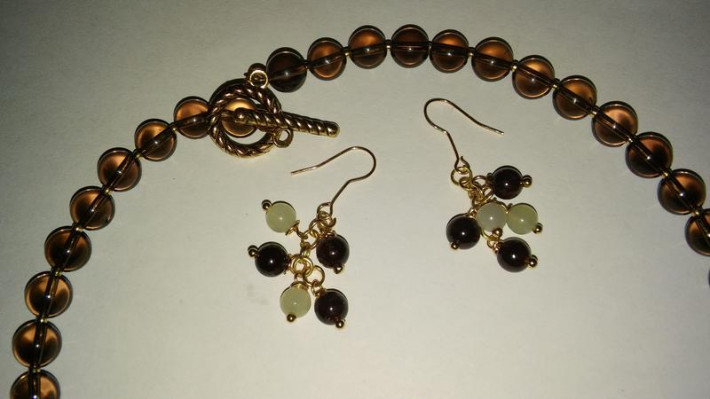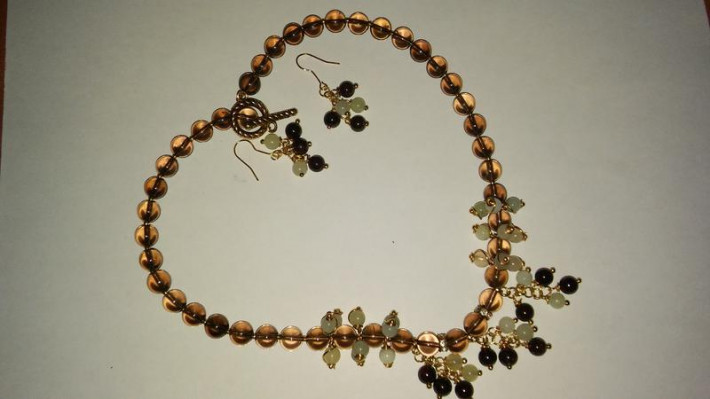 Комплект из серег и колье выполнен из агата, нефрита и граната, фурнитура под золото и оригинальный замочек, завершающий композицию колье. Прекрасно будет сочетаться с повседневной одеждой или вечерним нарядом. Я в Москве, возможен самовывоз м. Орехово, встреч по договоренности или отправка почтой.