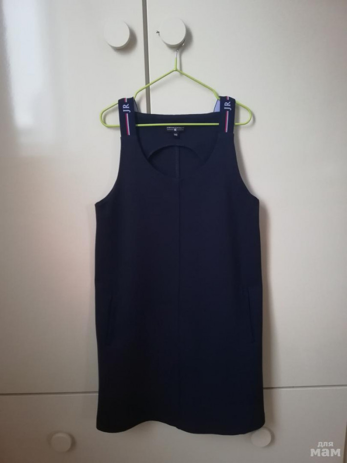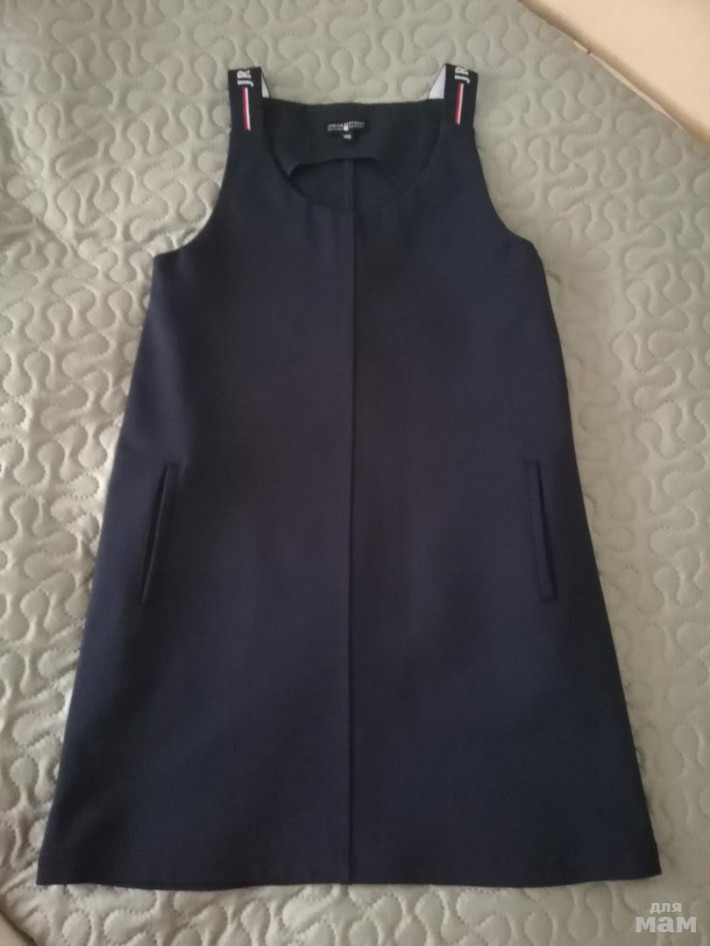 Школьный сарафан. Цвет темно синий. Состояние вещи отличное, нареканий нет. Качество превосходное. Состав хороший : вискоза, нейлон и чуток эластана. Это очень удобная и универсальная вещь . Стильный, красивый лаконичный , нет ничего лишнего) . Наш любимый. Я очень пожалела что взяла в одном размере, практически подходит ко всему . Лямочки -мягкие резиночки. Длина с лямками 70, ширина 36. (чуть чуть тянется) . Есть кармашки.