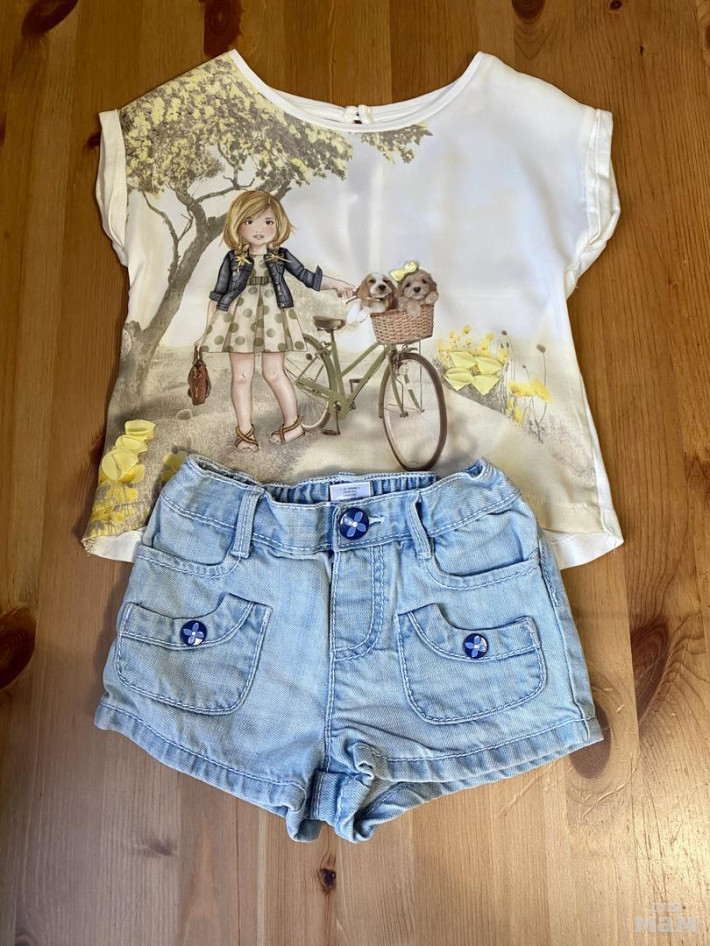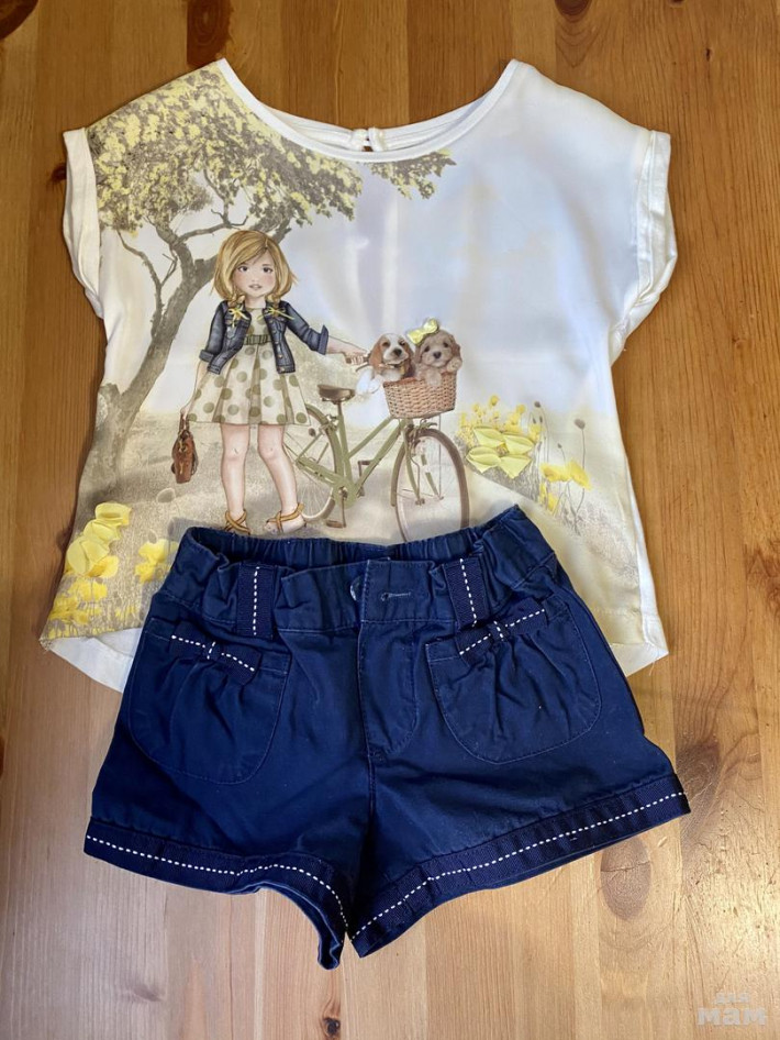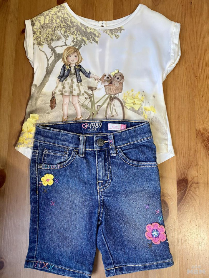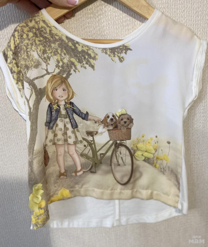 Очень нежный топ Испанской фирмы Mayoral, гонялась за ним в Европе. Перед шелковый, оформлен красивыми цветочными аппликациями, спинка трикотажная на двух пуговках. Очень мягкий и приятный к телу.