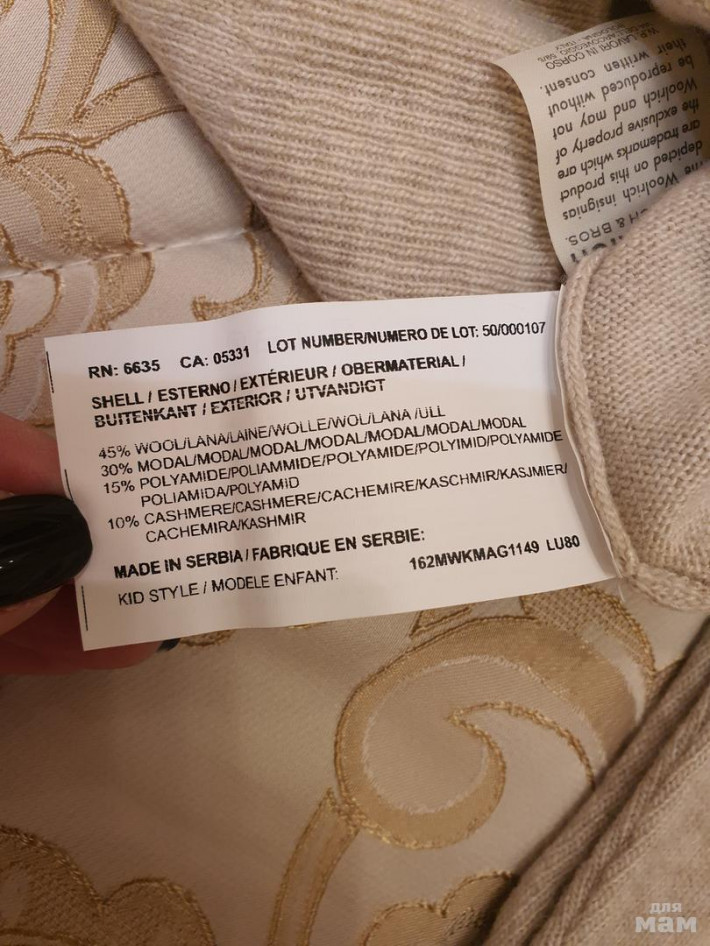 Очень стильный комплект, мягкий и теплый шерсть с кашемиром, бежевого цвета с отделкой золотой нитью в капюшоне, по рукавам и штанам. К сожалению фото не передает всей красоты костюма в живую.