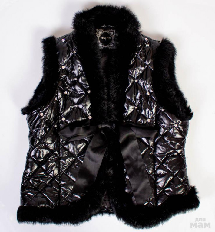 Жилетка Fun Fun с мехом и крупными стразами.Завязывается на лентыРазмер: 42 (на подростка или стройную маму)Состояние новой вещи, не носилиЦена: 1500 р