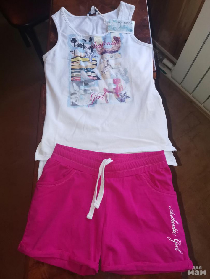 Отличный комплект на жаркое лето!!! на рост 152см примерно) Если девочка плотненькая то и на 146см будет отлично. Моя худоба из него вываливается.