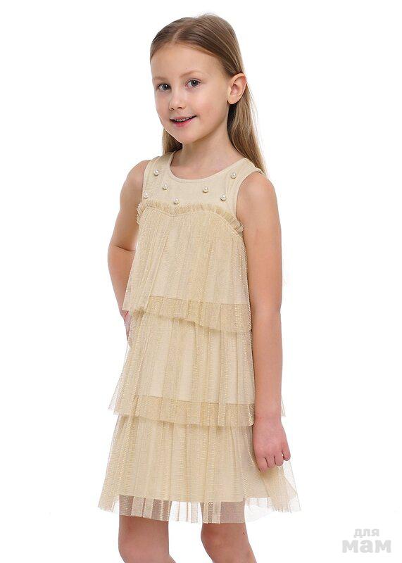 Нарядное платье приталенного силуэта из сетки с блеском на хлопковом подкладе. Юбка из 2 ярусов, расположеных симметрично друг друга. Кокетка переда украшена жемчугом, по спинке вырез со шнуровкой.