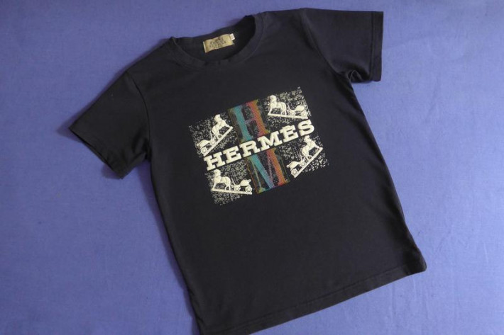 8. Футболка Hermes, на 5-6 лет, цвет темно-синий. Объемный принт, 100% хлопок. очень стильная. Цена 400 рублей .Есть маленький, незаметный в носке нюанс. Длина - 49 см , ширина - 37, 5 см.