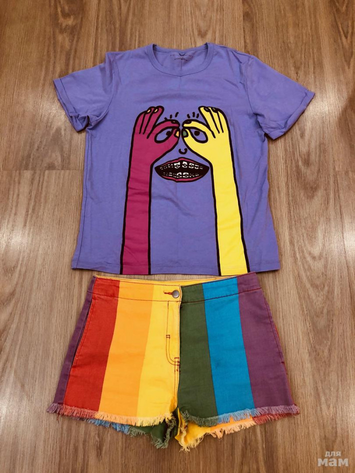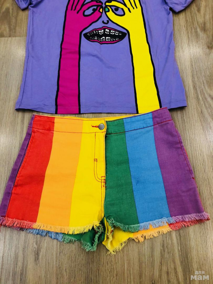 Брендовый комплект на лето (Италия) Стелла Макартни, нереально яркой рацветки, футболка руки и шорты в полоску к футболке, стрейч, такого ни у кого не будет, 14 лет, шорты талия 35, бедра 42, боковой 28-30 (есть утяжка)