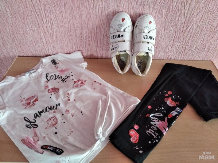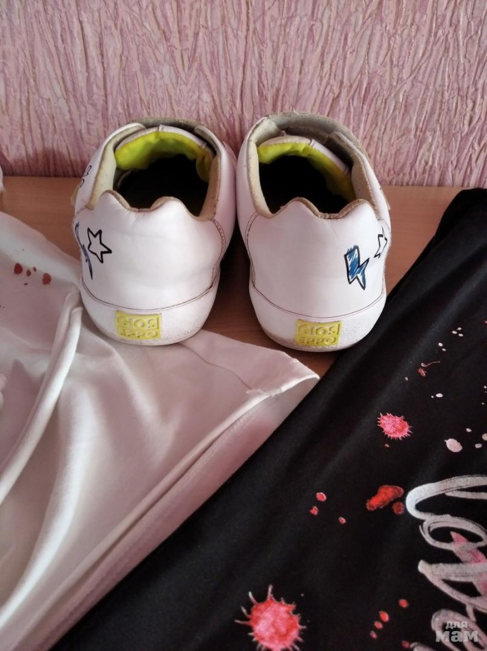 Комплект на размер 128-134, в хорошем состоянии. Футболочка спереди внизу на завязочках, которые свисают. Длина по спинке 45 см, ПОГ 36,5см. Лосины шаговый 52 см, длина 69,5 см. Цена за комплект 1000 рублей. Кеды GiosEppo kids 34 размера, но маломерят на 33 размер. Стелька примерно 20,7-21 см. Застёгивается на две липучки. Внутри отделаны мягкой тканью, как и сама стелька - мягкая. Цена 400 рублей.