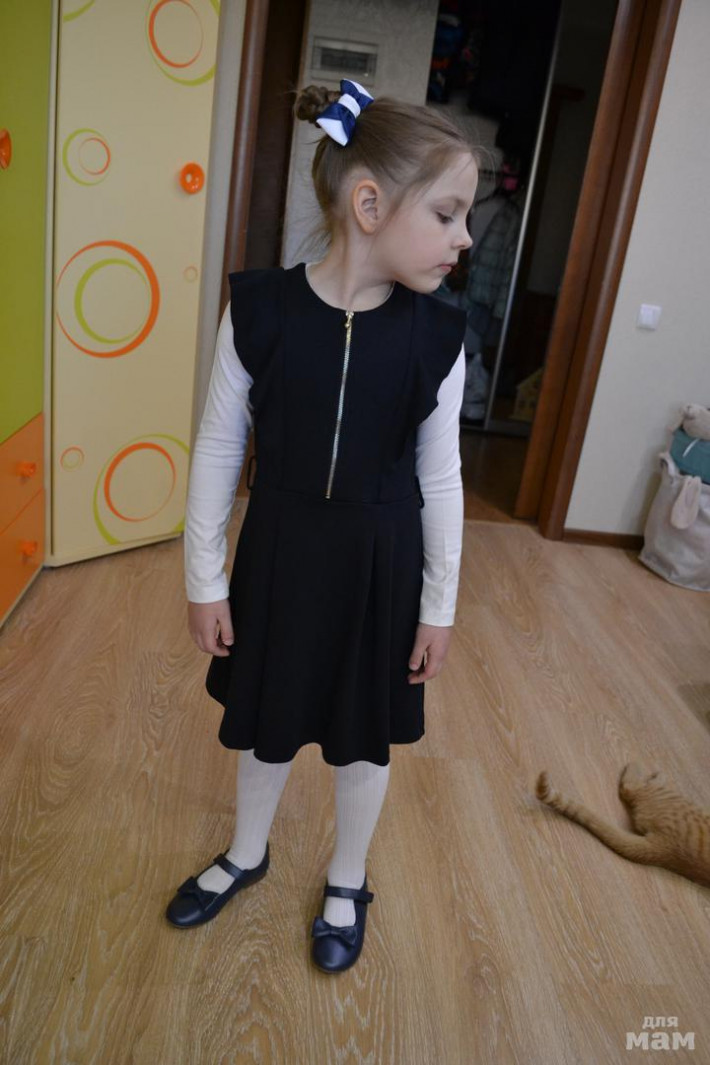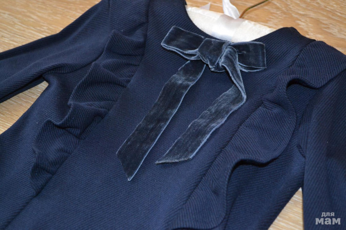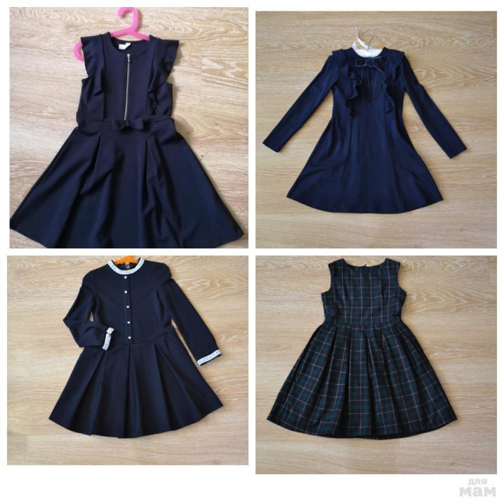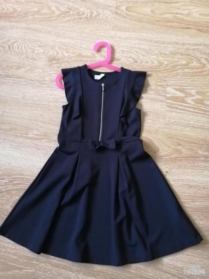 1. Платье для школы тёмно - синего цвета Sela. Из плотного трикотажа. Бантик из бархатной ленты. Р. 122, на рост 116-122 см. Сзади длинная молния. Материал немного тянется. Состояние очень хорошее. Замеры: длина платья 62см., рукав от плеча 42см.