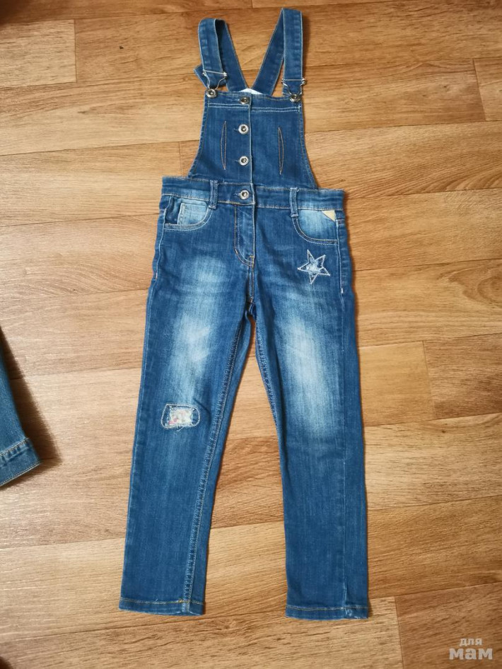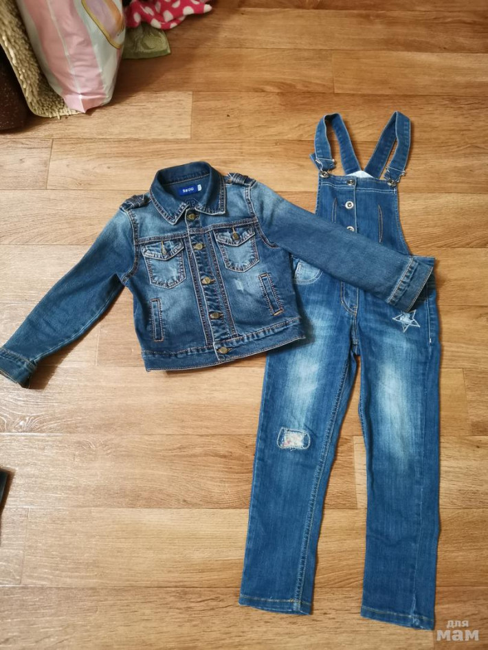 Джинсовый комплект на 4-6.лет, до роста 125. Состояние Нового. Комплектом Куртка, джинсы, комбинезон.