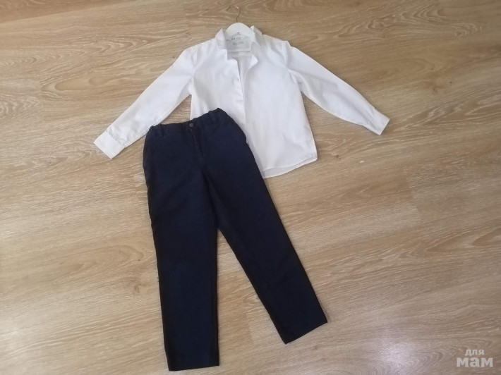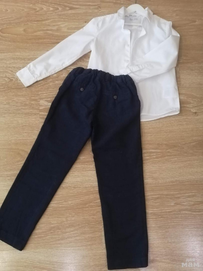Рубашка H&M р. 128. Подойдет на рост до 130-132см. Easy Iron - модель, которая легко наладится. Брюки h&m тёмно синего цвета. В составе лен и хлопок. Размер 134, подойдет на рост до 130-132см. Замеры вещей есть на фото. Все в хорошем состоянии.