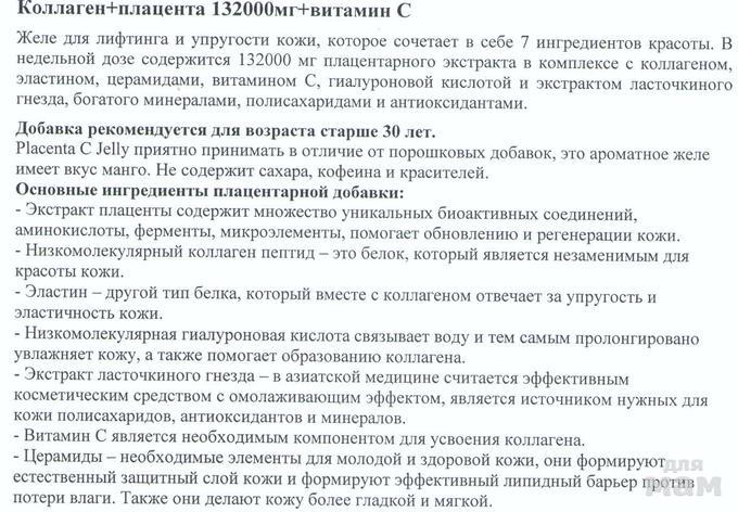 "Желе для лифтинга и упругости кожи, которое сочетает в себе 7 ингредиентов красоты. В недельной дозе содержится 132000 мг плацентарного экстракта в комплексе с коллагеном, эластином, церамидами, витамином С, гиалуроновой кислотой и экстрактом ласточкиного гнезда, богатого минералами, полисахаридами и антиоксидантами.