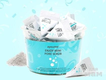 AYOUME Enjoy Mini Pore Scrub – сочетает функции скраба и пилинга, обеспечивает двойное очищающее воздействие на кожу: физическое (сода) и химическое (AHA, BHA и PHA кислоты).