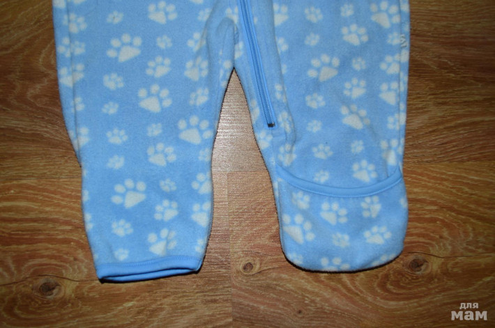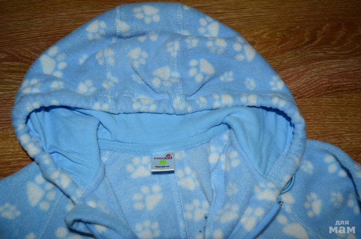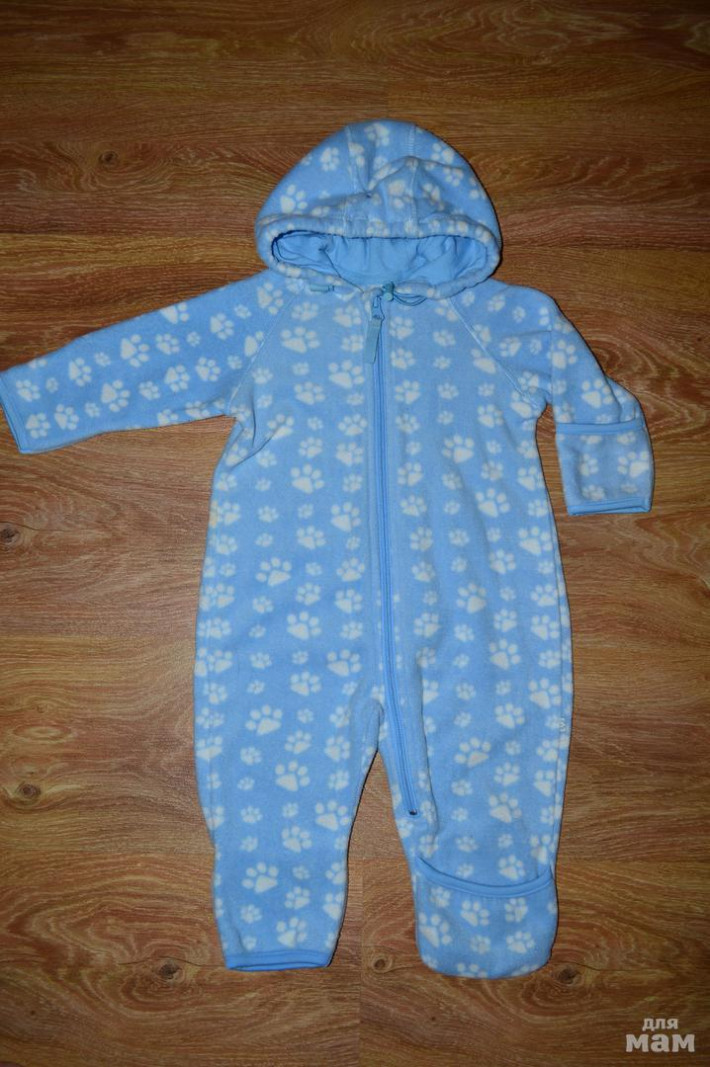 Комбинезон с набивным рисунком из флиса. Несъемный капюшон, внутри утяжка со стопперами, подкладка из гладкого хлопка. Длинные рукава реглан. Спереди застежка-молния с защитой для шеи. На руках и ногах отворачивающиеся рукавички и носочки.