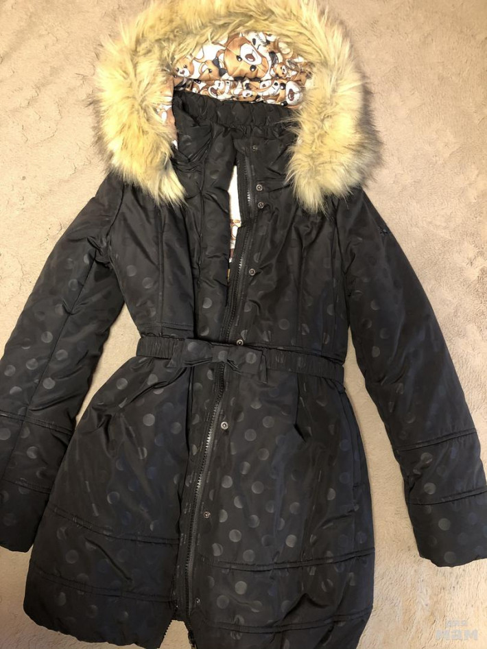 Пальто Monnalisa. Размер 12. В отличном состоянии. Чёрное, чёрные кружочки. Тёплое.