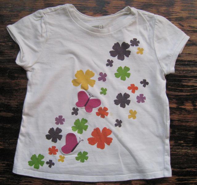 футболка, на 5 лет, носили дома и на даче. дырок нет, есть пятна, катышков нет, аппликация и вышивка без катышков.