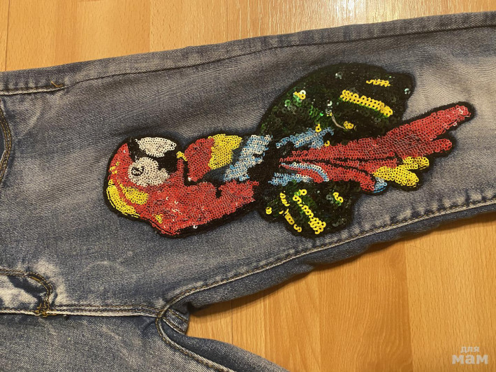 Сама по себе ткань очень мягкая!! на лето супер! Паетки внутри не чувствуются- попугай нашит на отдельную ткань и потом пристрочен к джинсам (я так думаю)