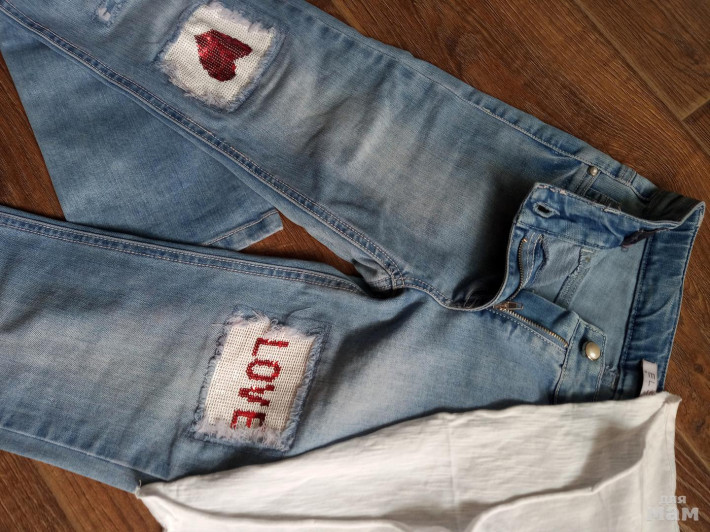 Комплект в хорошем состоянии, футболка тонкий хлопок. На рост 134, можно до 140 если стройная....или раньше по-свободнее футболка и джинсы подвернуть ;))