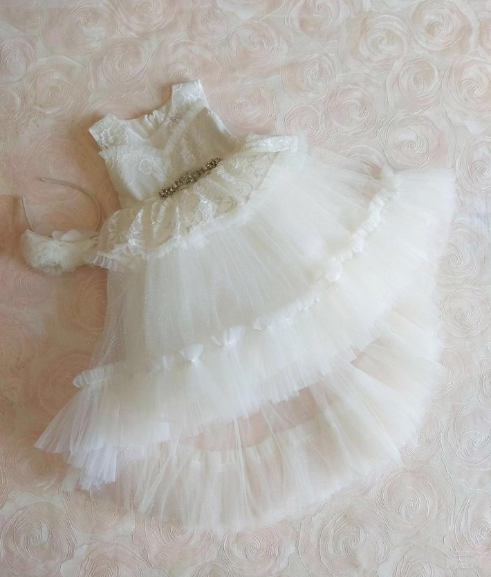 Белое мерцающее платье с пышной юбкой в комплекте ободок с цветами.