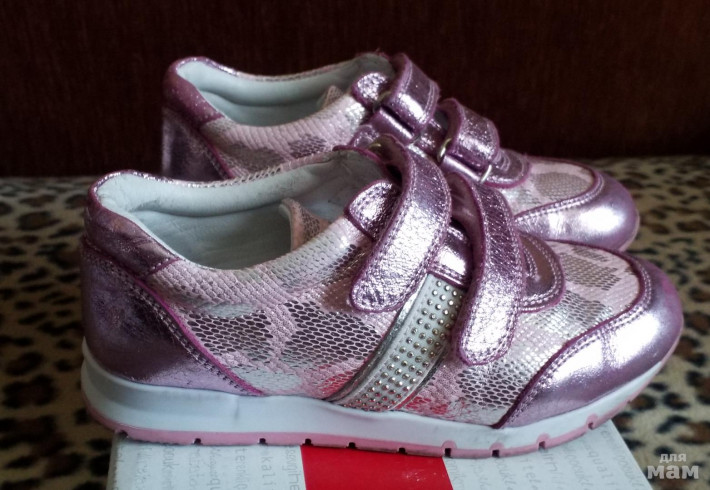 Кожаные кроссовки Toddler р. 30, стелька 20 см Турция. Состояние очень хорошее, носили только в саду на физкультуру. Слегка потерты мысы, но этого практически не заметно. Кожа везже, покупала за 3800 р. Все металлические стразы на месте. На двух липучках. Все переливаются.