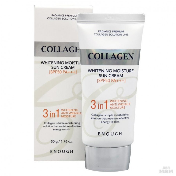 ля всех типов кожи Применение За 30-40 минут до выхода на солнце нанести крем на лицо, шею, уши и другие открытые участки кожи. Не забывайте обновлять слой солнцезащитного крема каждые несколько часов. Эффект Защита от солнечных лучей Enough Collagen 3in1 Whitening Moisture Sun Cream SPF50 PA+++ Солнцезащитный крем для лица с морским коллагеном Увлажняющий солнцезащитный крем с морским коллагеном Enough Collagen 3in1 Whitening Moisture Sun Cream SPF50 PA+++ одновременно сочетает в себе функции ухаживающего и фотопротерного продукта.