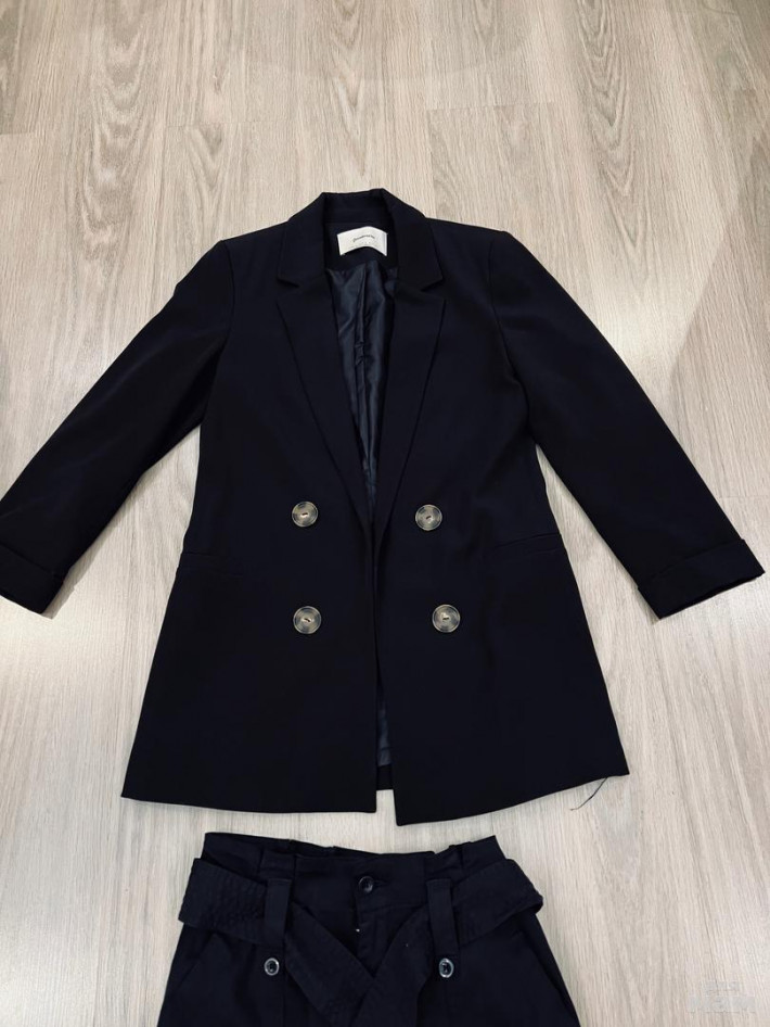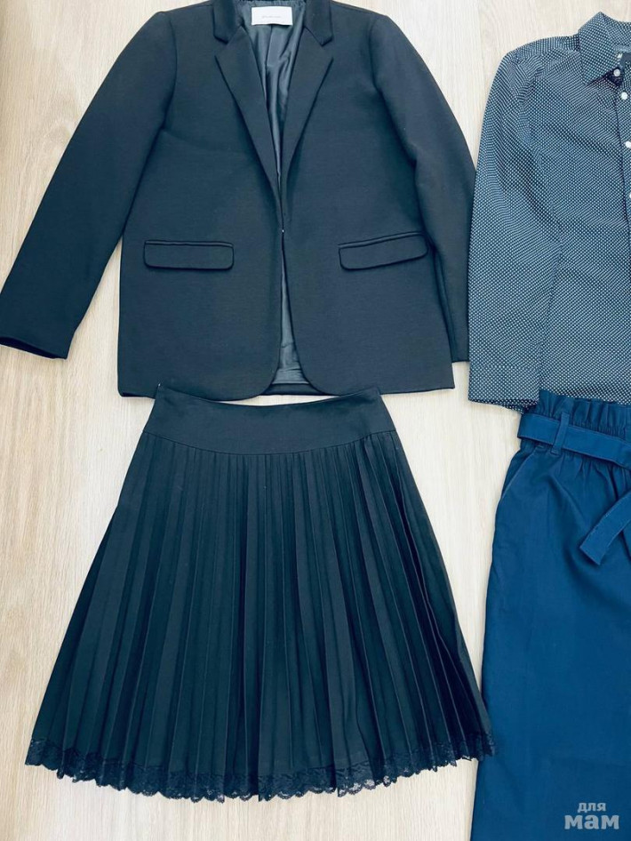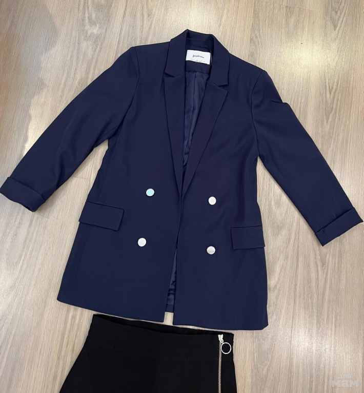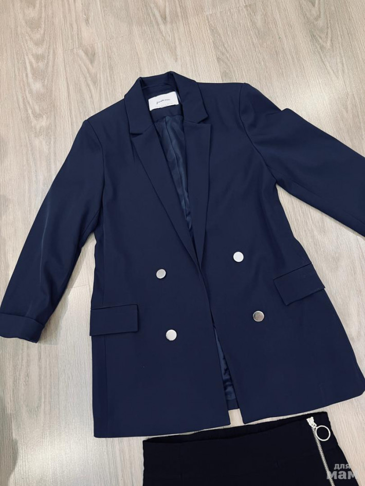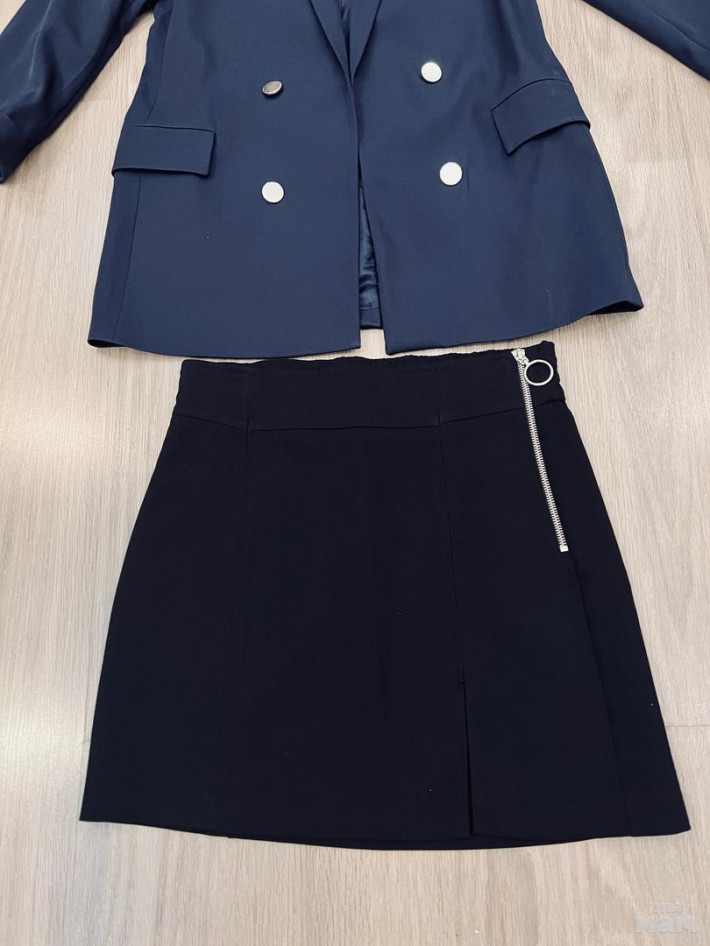 Новый синий пиджак Stradivarius, р.S, длина 75, рукав укороченный 52. Новая черная юбочка Bershka, р.M (маломерит), длина 43, талия сзади на резинке 35, бедра 44. Комплект 2500 р. (один пиджак 2000 р.)