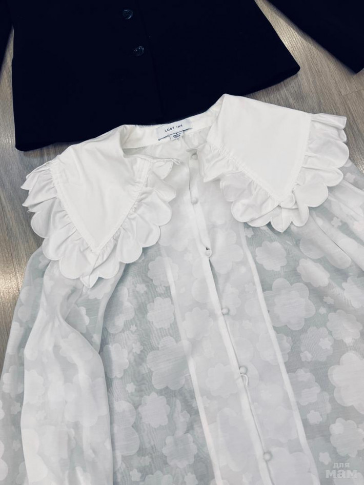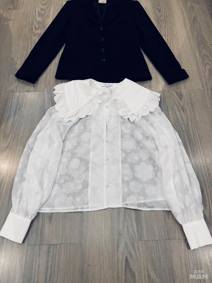 Черный пиджак Fopt б/у 42 р.приталенный (рукав 60, талия 42, длина 63), белая блузка свободного кроя, новая с большим воротником Lostink р.8 (длина 58, рукав 62, под мышками 56). Серый стильный пиджак в крапинку Topshop р.34, 34, рукав 50 (укороченного фасона), под мышками 44, талия 43