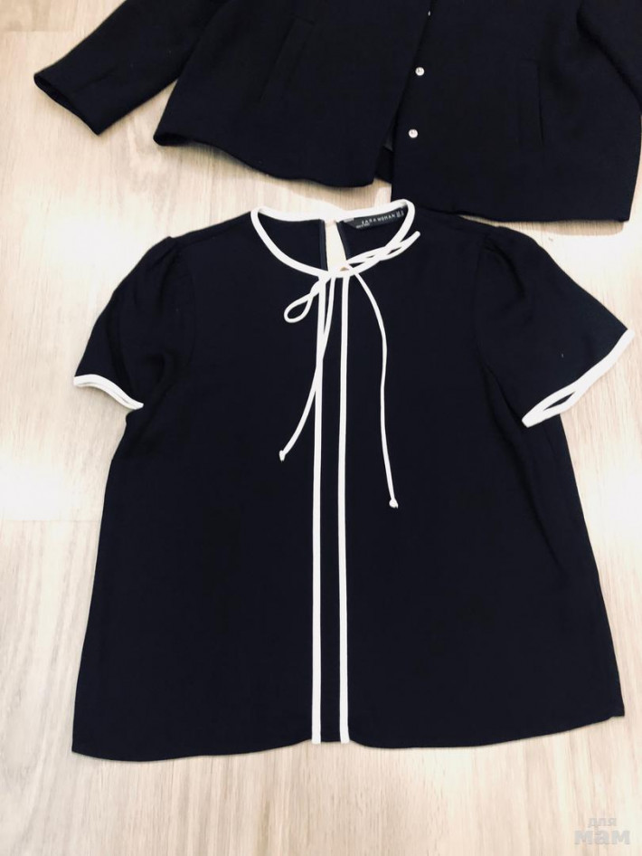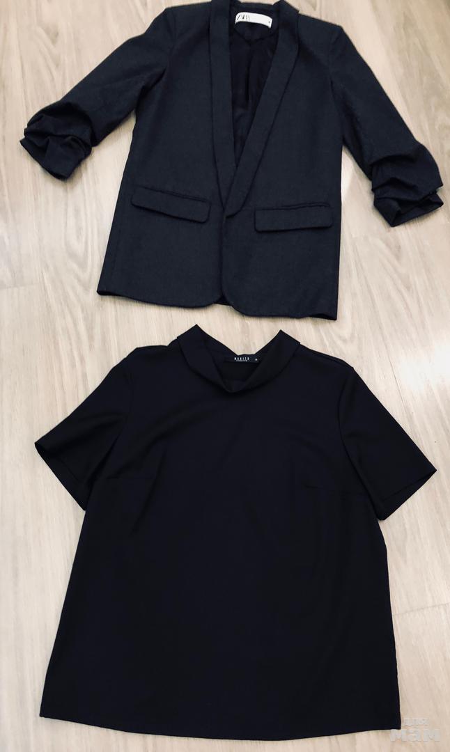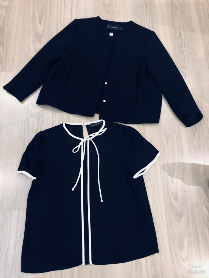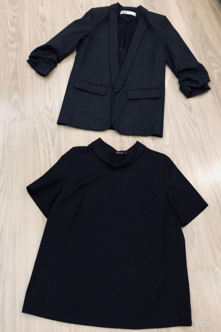 Пиджак черный Зара расклешенный рукав укороченный 52, длина 56 (не носили), блузка черная Зара с коротким рукавом свободного кроя ( одета один раз) под мышками 45, длина 56, рукав 20