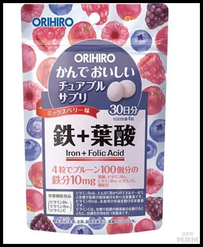 Железо и фолиевая кислота - жевательные таблетки с ягодным вкусом. 4 таблетки содержат 10 мг железа, столько же содержится в 100 черносливок.