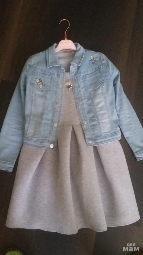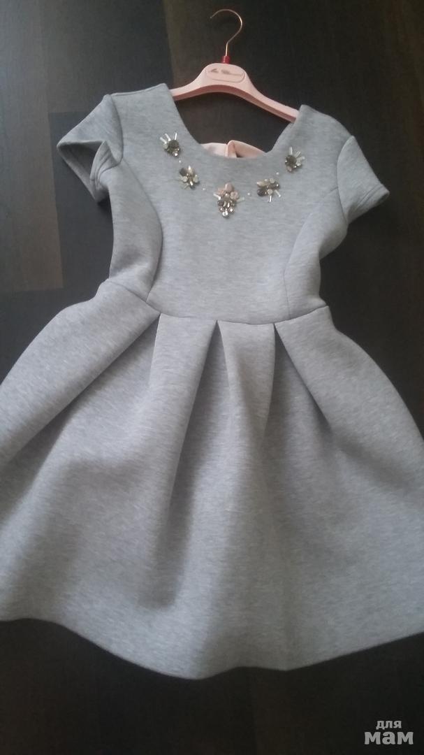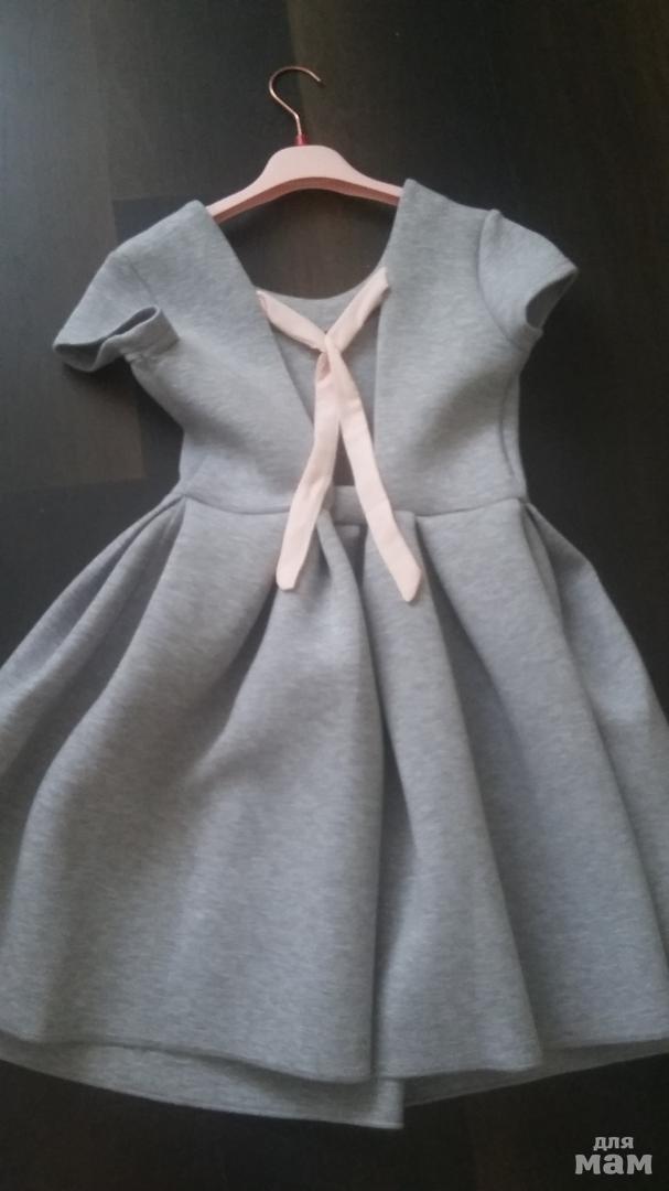 Нарядное платье из неопрена (не мнется) с открытой спинкой, сзади украшено лентами, спереди - цветными камнями. Надето пару раз. В отличном состоянии.