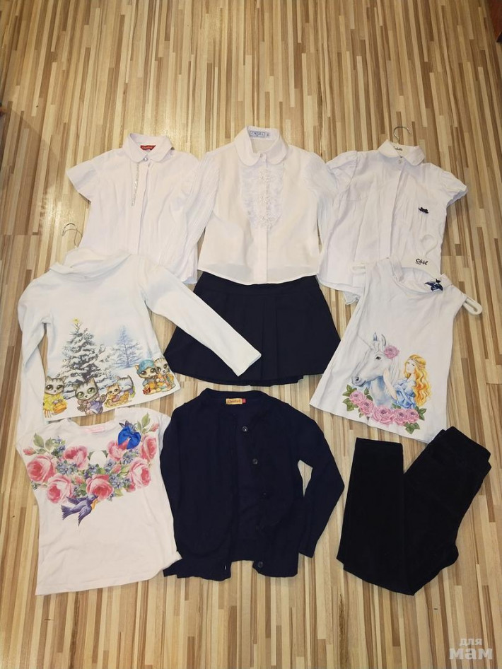 2 рубашки и темно-синяя кофточка фирмы Честерфорд,1 рубашка и юбка фирмы смена,3 кофточки фирмы стильняшка и вельветовые брюки.