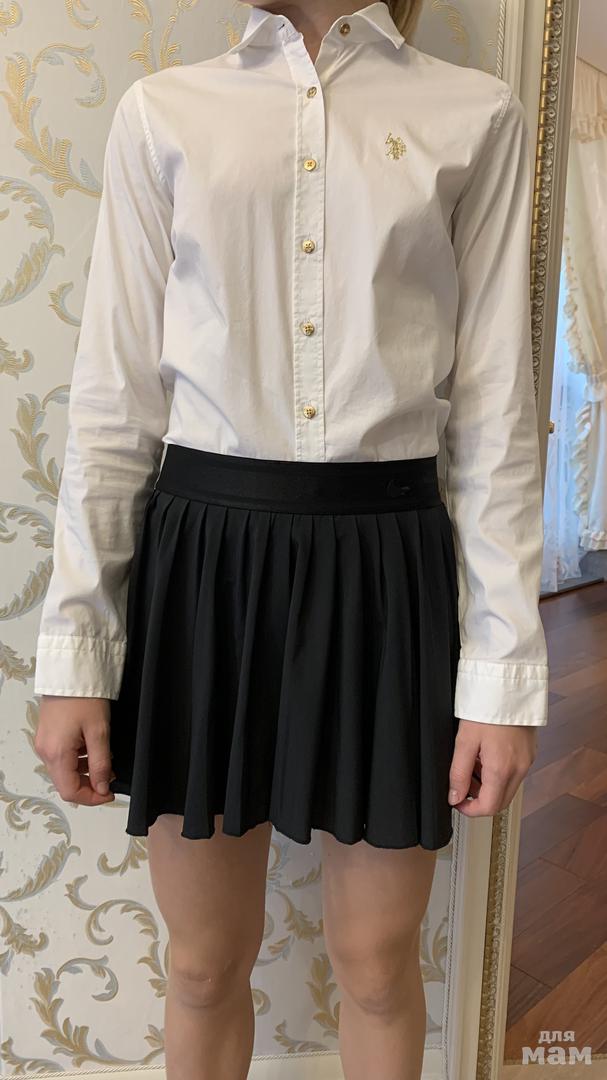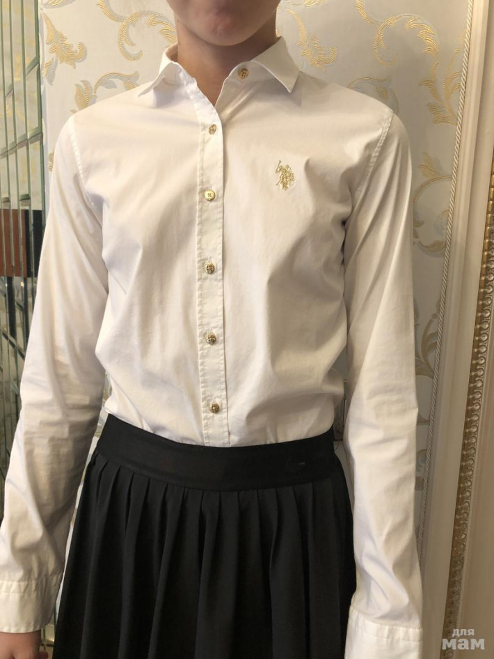 Белая рубашка приталенного кроя .Фурнитура золотистая.Рубашка в идеале,носили мало.Размер XS .Носили при росте 155-157.Дочка теннисистка ,плечи у нас размашистые.